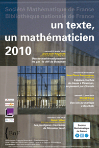 Quatre conférences de mathématiques vont être organisées à l'attention du grand public, des professeurs du second degré et des lycéens et étudiants au cours de l'année 2010. Elles auront lieu le mercredi à 18h30 à la BNF (site F.-Mitterrand, Grand auditorium, Hall Est, Quai François-Mauriac, Paris 13).