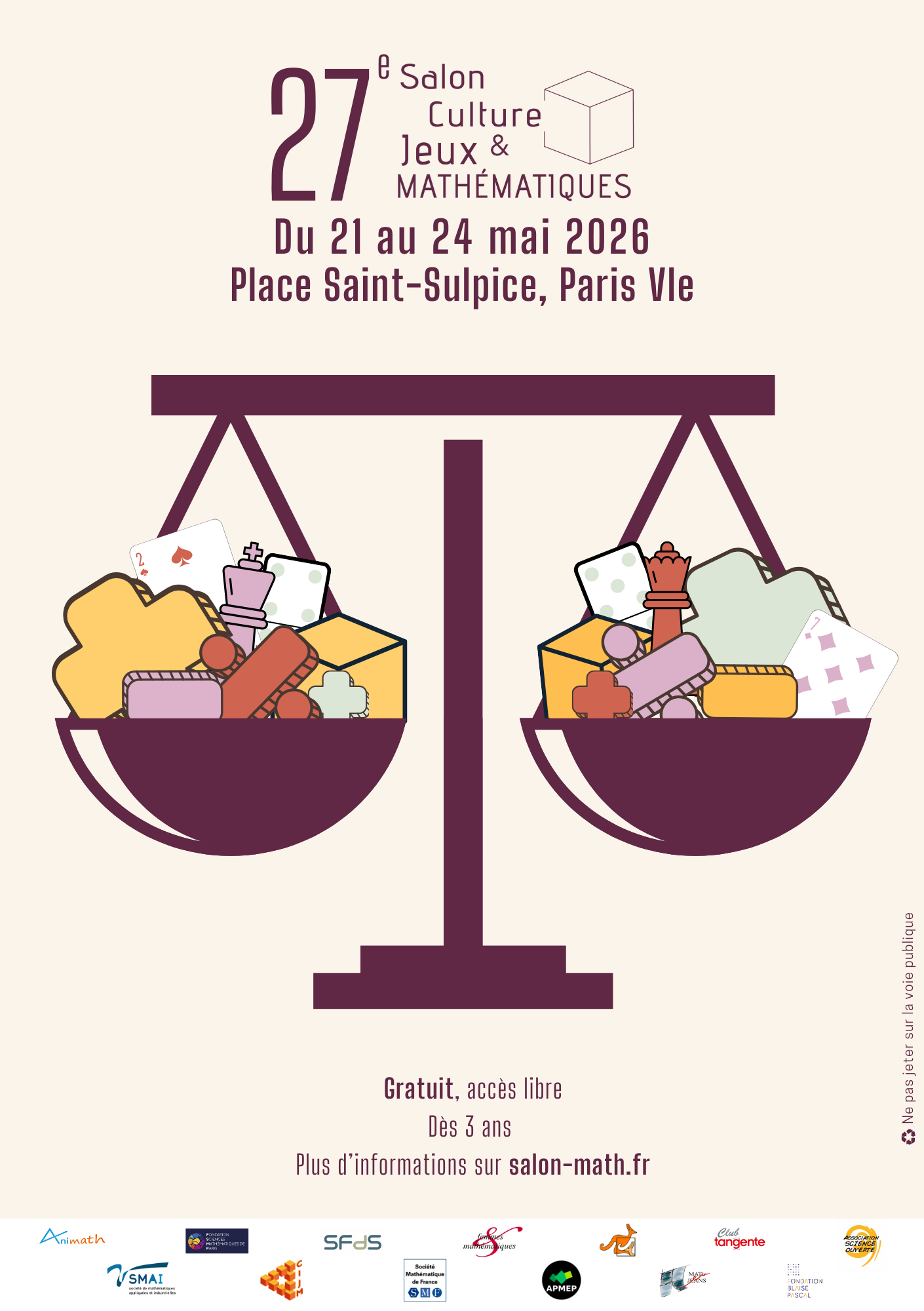 Le Salon Culture et Jeux Mathématiques revient du 21 au 24 mai 2026 pour sa 27e édition, sur la place Saint-Sulpice à Paris !